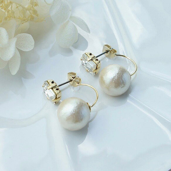 ブランド:大人可愛いピアス・イアリングAllesLiebe[アレスリーベ]2way パールキャッチを他のピアスと合わせても○ 人気のコットンパール スクエア型のスワロフスキー clear◇ぶらさがりコットンパールのピアス 楽しみ方いろいろ♪