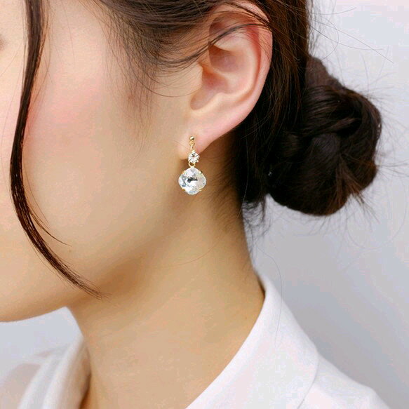 ブランド:大人可愛いピアス・イアリングAllesLiebe[アレスリーベ]金属アレルギー対応! キラキラと美しく輝く アゾレのスワロフスキーの大人可愛い まるでピアスみたいな樹脂製イヤリング 【イヤリング(樹脂ノンホールピアスタイプ)】"Azure"クリスタルストーンとスクエアスワロフスキーイヤリング こちらのお品は【イヤリング】(樹脂製ノンホールピアス)です。
